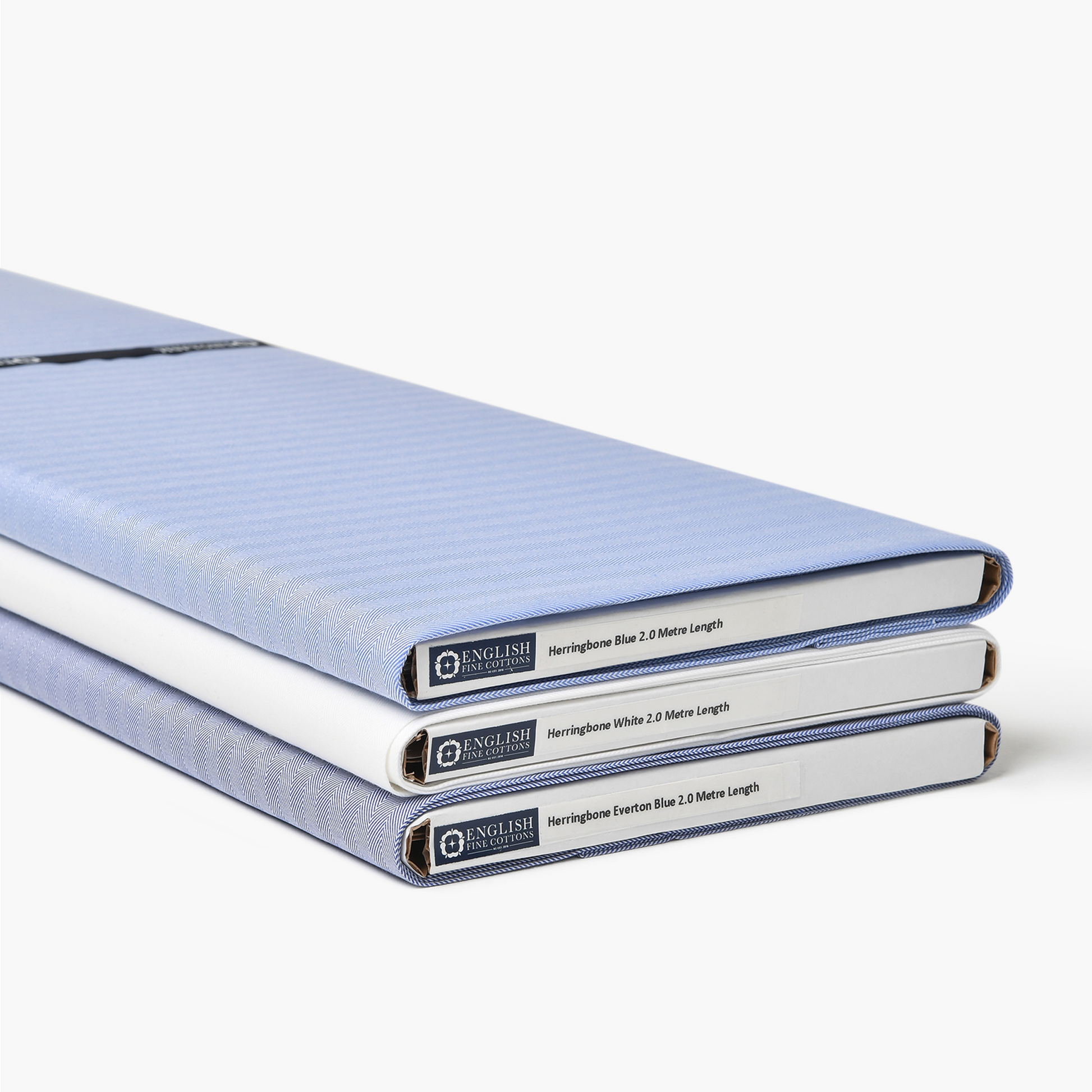 Our Herringbone is available in three colours - two shades of blue, and white. English Fine Cottons Shirting fabrics are provided cut to length on cardboard bolts. We offer two standard sizes, 2m and 2.5m. Alternatively, all materials are available on rolls in larger quantities on request.